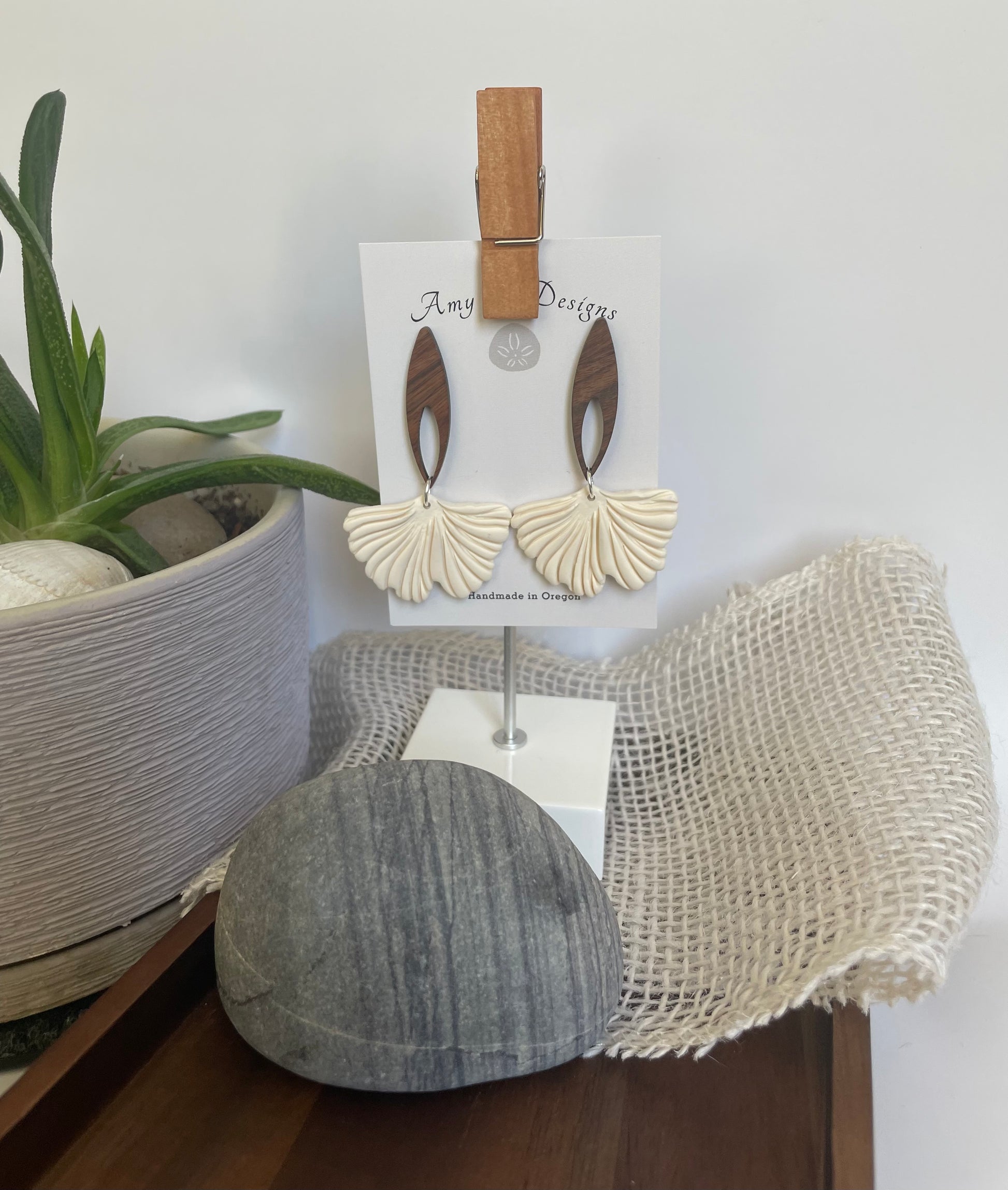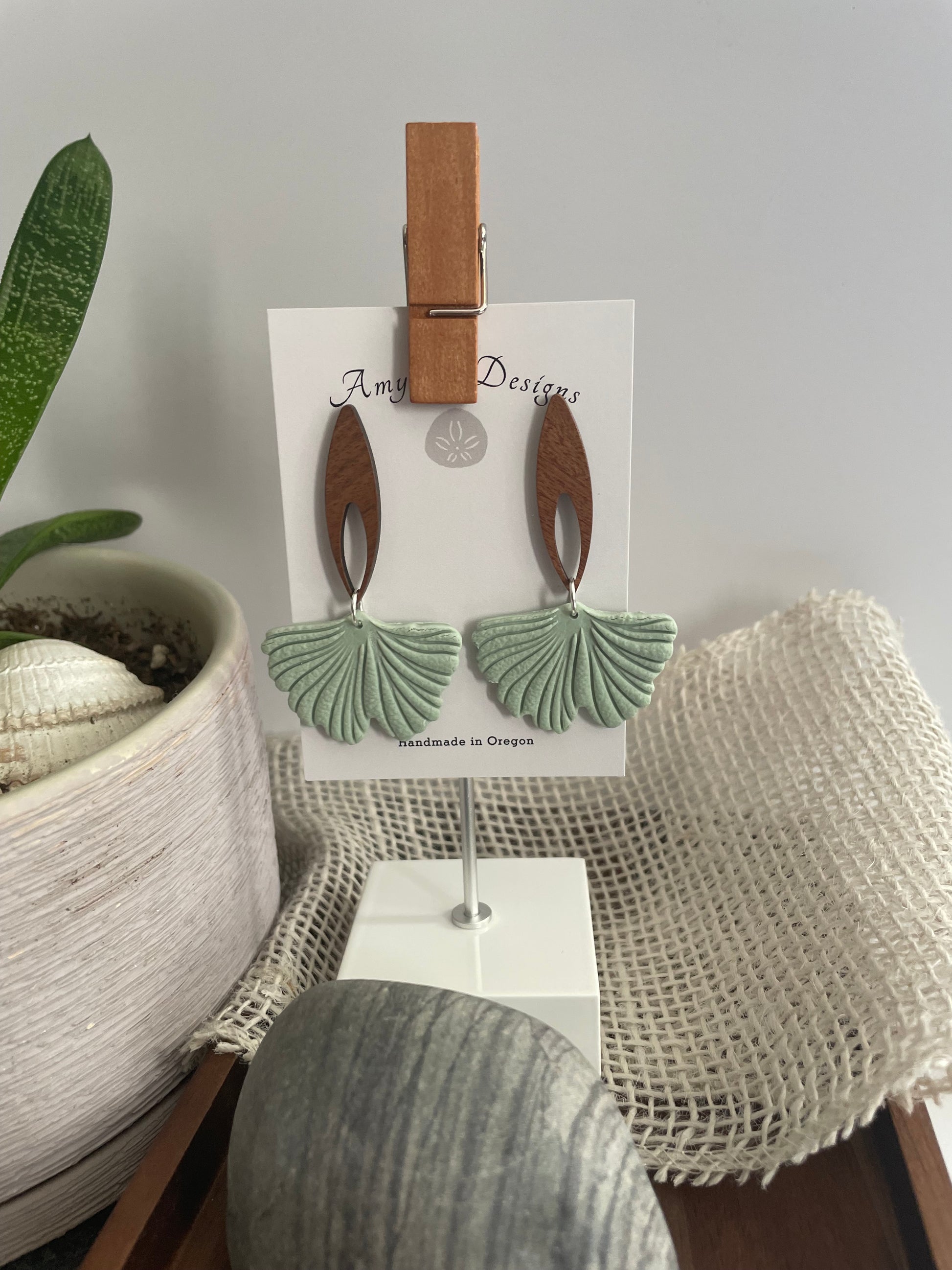 Ginkgo leaf dangles. Cream and green, both w/wood stud. List weight polymer clay. Handmade in Oregon.