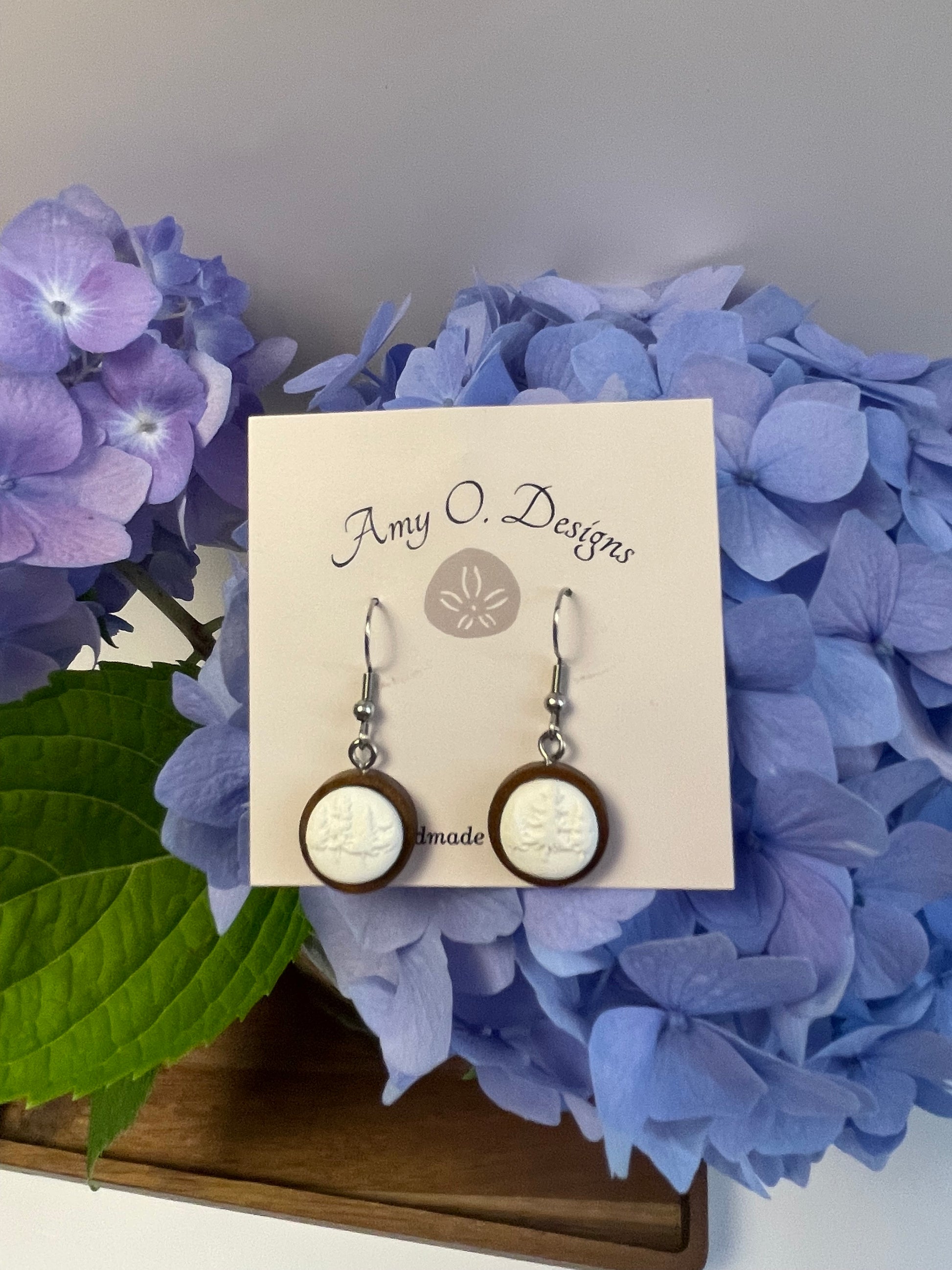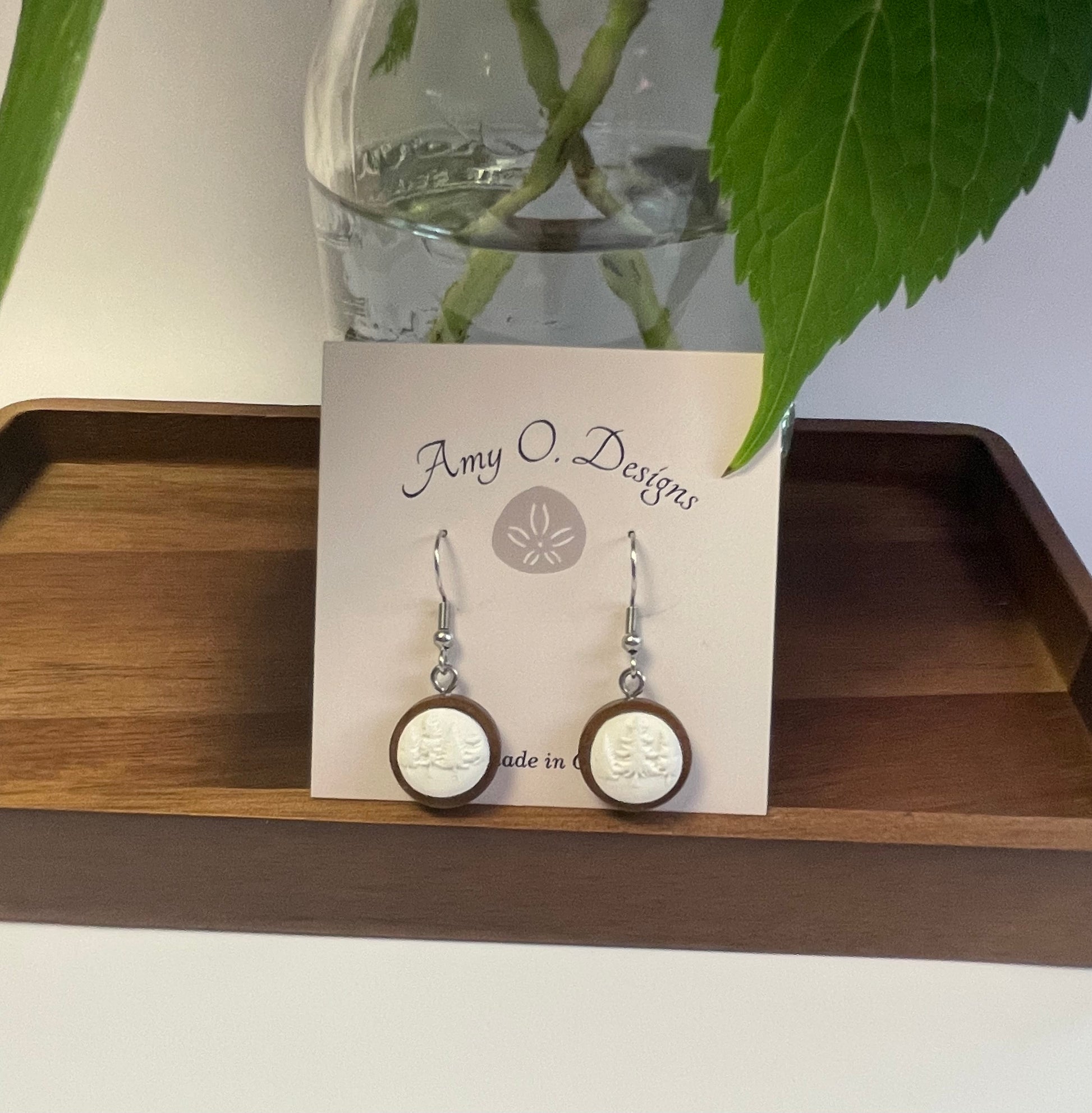 Small, brown circle w/white polymer clay trees. Silver ear wire. Light weight.